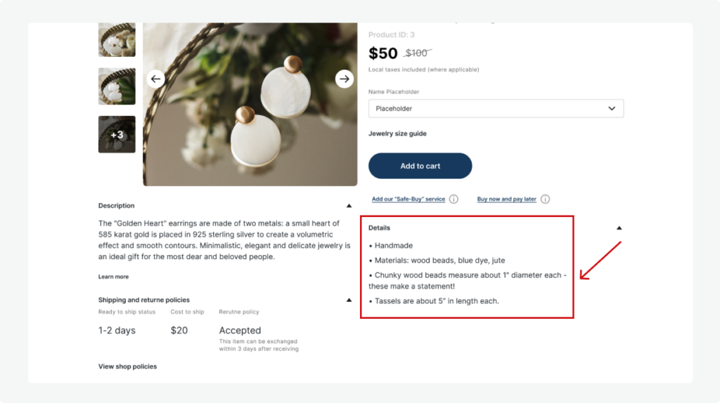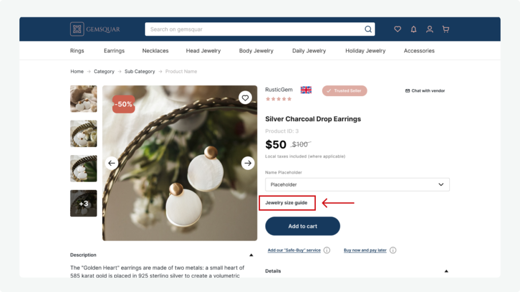 For the Product details page, we added the new “Display the Jewelry size guide” checkbox to the category editing page. If this setting is enabled, the Jewelry size guide appears. After clicking the link a customer sees the Jewelry size guide table in the popup without redirecting to another page.