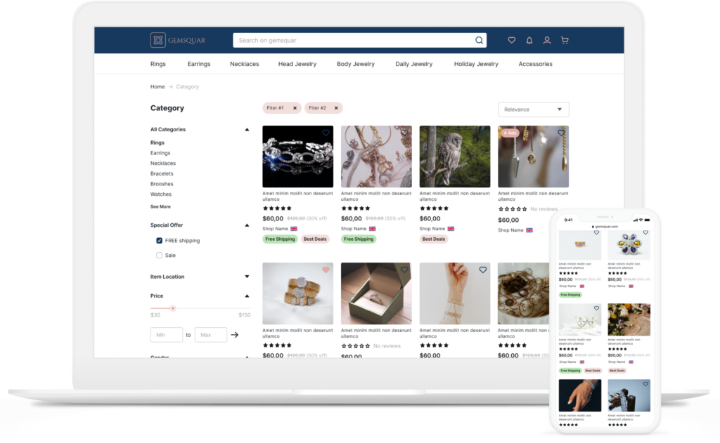 Gemsquar is an online multi-storefront marketplace. Its offline store was first founded back in 2015 in Geneva, Switzerland to sell precious stone jewelry. Since then, the company has decided to go online. In 2021 they chose us as their technology partner for hosting, add-ons and customizations as the company CEO believes we are the ones who can implement their goal at the best – to build a jewelry marketplace.
