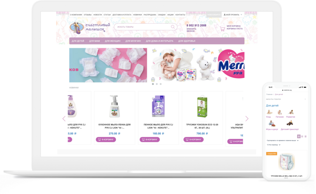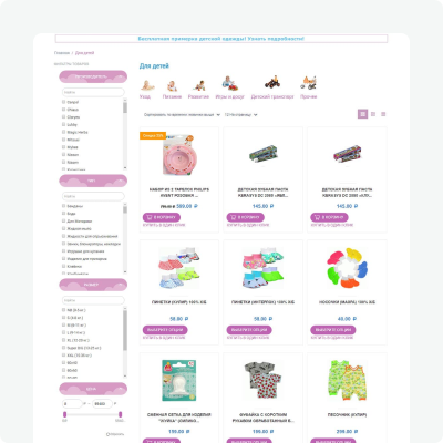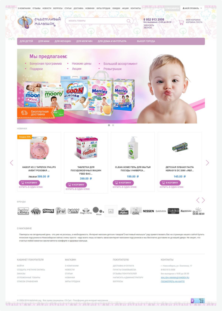 Malishok is an online store based in Russia. The store specializes on products for children - diapers, baby food, baby strollers, child car seats, baby clothing, clothes for pregnant women and other useful goods. The design project of this store was based on our CS-Cart theme and adapted to the brand style.