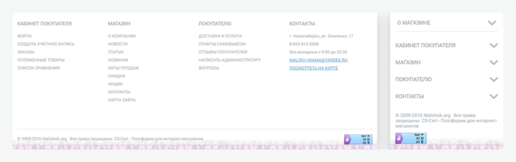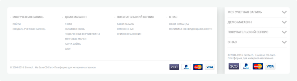 The old footer was cut down and did not benefit. We used the standard CS-Cart footer. This well-planned and organized footer will help shoppers to find all the necessary information.