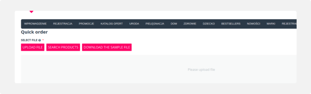 We added the default file loader to upload a CSV file on the “Quick order” page. It opens by clicking on the “Import file” button. The file contains the product quantity and code information.