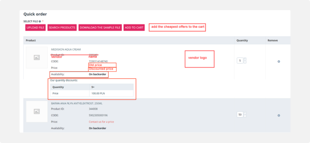 We introduced a new button named as Add the cheapest offers to the cart. The new button shows the cheapest common product. If there are two identical products sold by two vendors, the products will be displayed one after another. The cheaper product will be displayed first.
