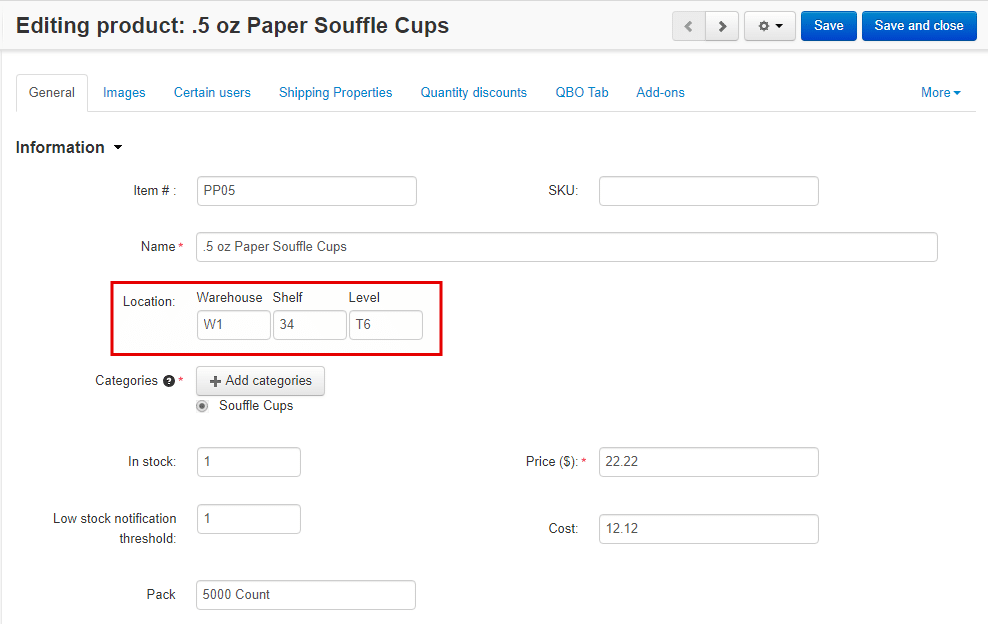 We introduced a functionality for an ease finding of the place where an item is located in the warehouse. You can see it in the “Location” field in the Figure below. Now, every item in the store is accompanied with the IDs showing the warehouse’s, the shelf’s, and the level’s numbers. It is a very handy feature helping to organize and easily find products of a large inventory.