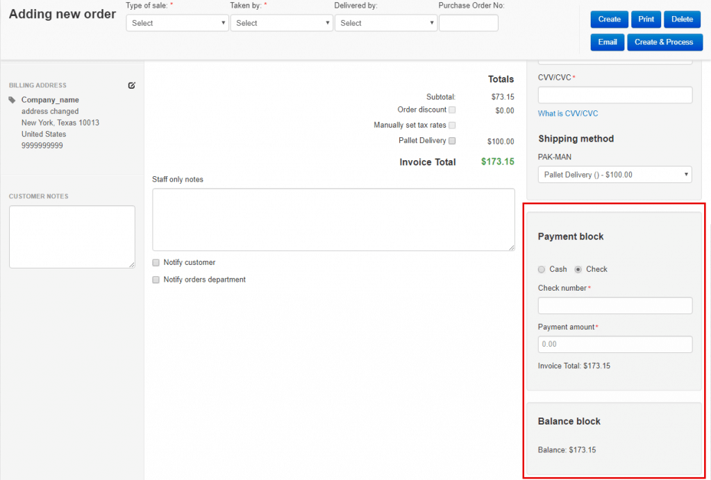 We added the payment block with input and radio buttons to the order creation page. If a client is going to pay by cash, the administrator selects “Cash” and enters the amount. If a client is going to pay by check, the administrator selects “Check” and enters the check number.
