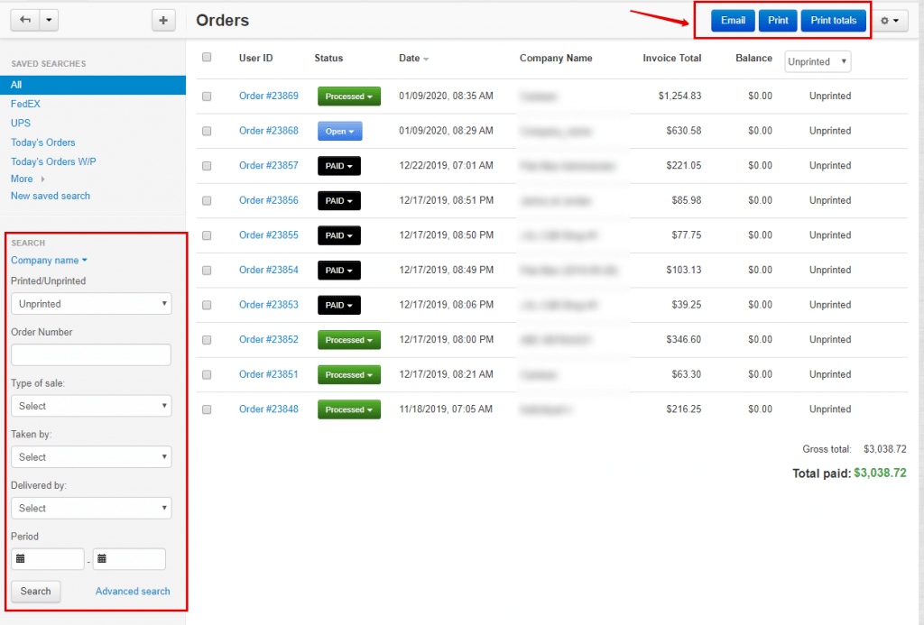 We added special buttons to enable printing Order Reports on the “Orders” page. Now, the user can search for orders using the filter on the left side of the page, and a list of orders is returned that can be printed out or sent to the email by clicking of the “Print” button.