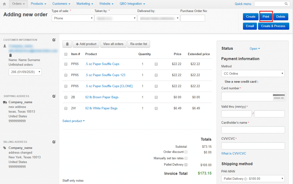 We added an ability to print an unfinished order and put the “Print” button on the order creation page as shown in the screenshot below: