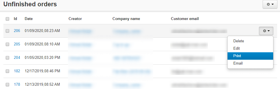 We added the “Print” button under the gear button to each unfinished order.