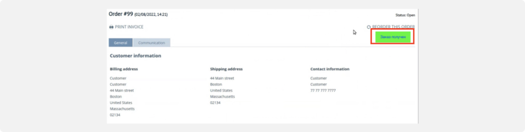 The new modification adds restrictions on transferring orders to certain statuses. Transferring an order to a status is possible only when attaching a track number to the order. The administrator can specify for orders in which statuses the “Order received” button (green color in the figure) on the storefront will be displayed.