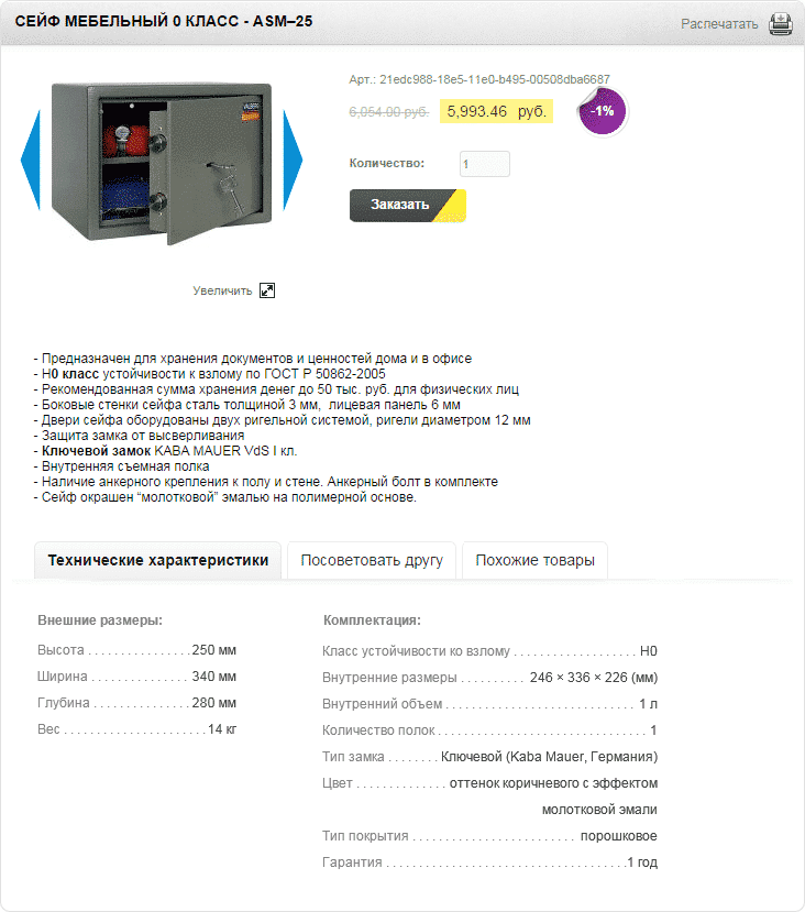 The Russian company Safe-DV, which specializes in safes, metal shelving, furniture, carts, and other equipment for warehouses, decided to go online in 2012. We helped them create a solid and respectable online store.