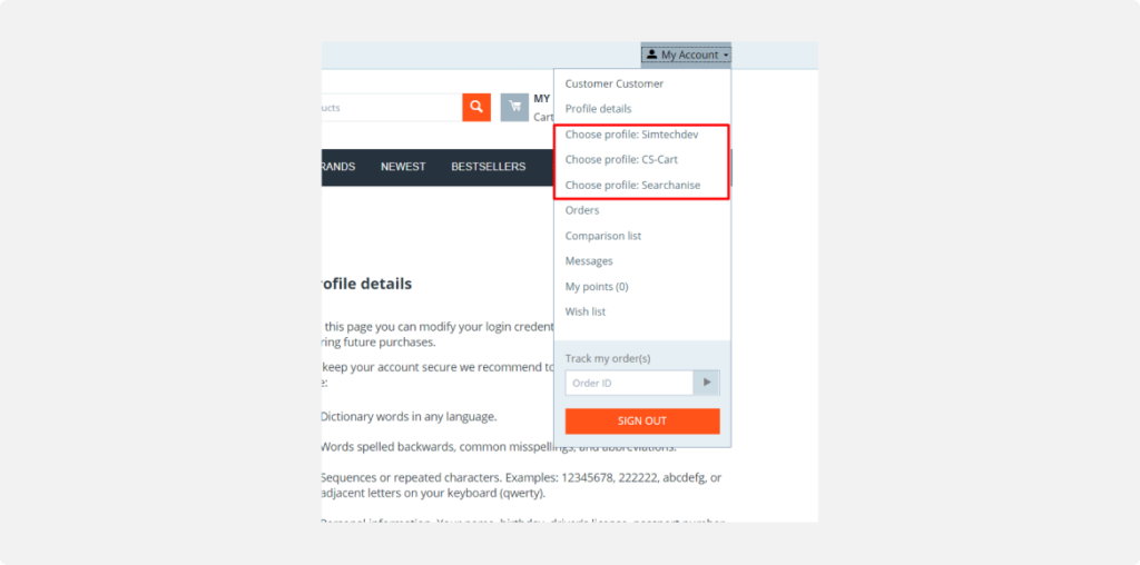 We modified the project accordingly so that each client could place an order exactly from the organization that makes purchases on the site, and the information of the selected profile is displayed in the invoice. Our team developed a dedicated add-on for this functionality. It extends the standard multiprofile functionality. On the storefront we added an ability to choose a profile in the “My profile“ block. The profile fields from the chosen profile are used at checkout.