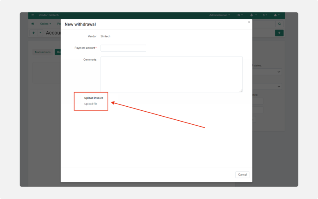 Our devs made an add-on that offers the ability for vendors to attach a file to a withdrawal request. We made it possible to display the ”Upload file” on the “New withdrawal” pop-up available on the Accounting page.