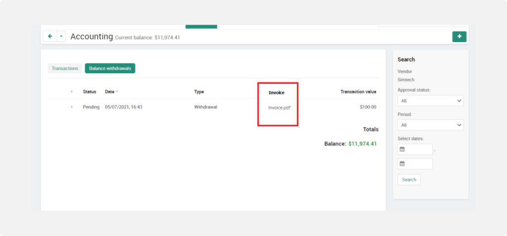 The uploaded file can be viewed after each withdrawal request in the new “Invoice” column on the Accounting page.